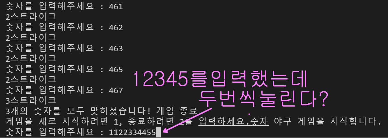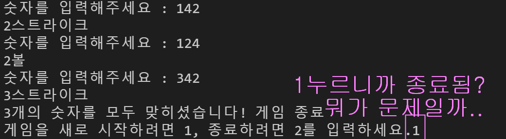 에러1 - 재시작 여부 입력을 안받고,(뭔가 이 시점에 문제) 바로 새게임이 돌아가버림
