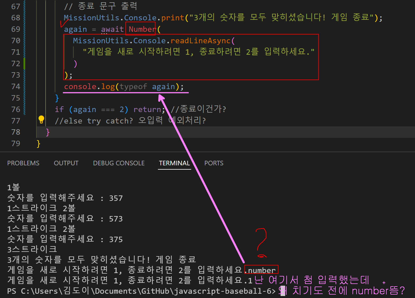 에러3 - MissionUtils.Console.readLineAsync() 얘 string 반환이었음