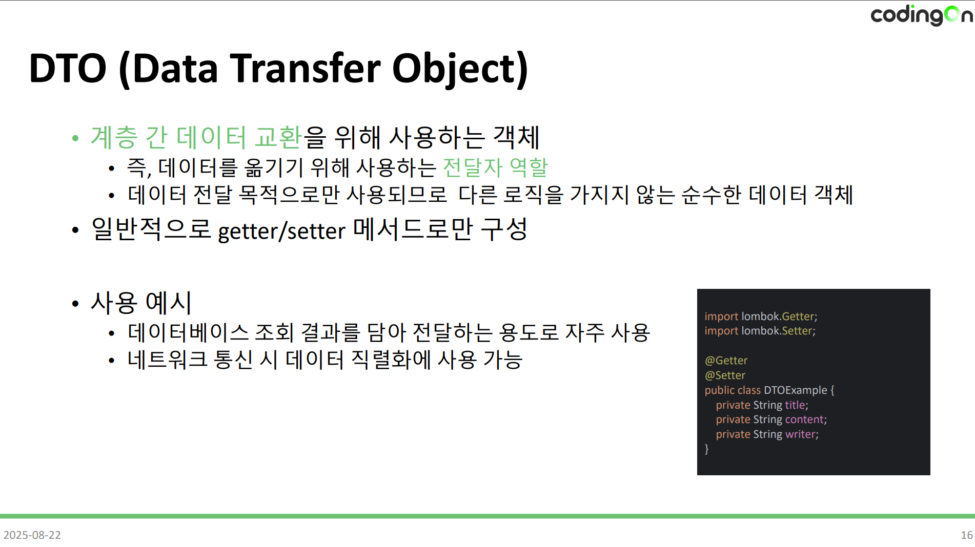 ㄴ데이터 전달 목적으로만 사용되므로 다른 로직을 가지지 않는 순수한 데이터 객체