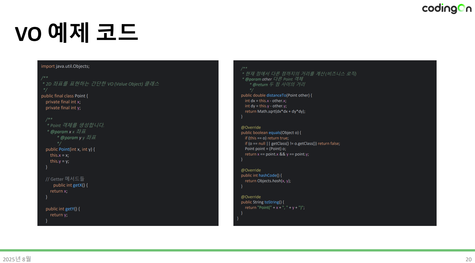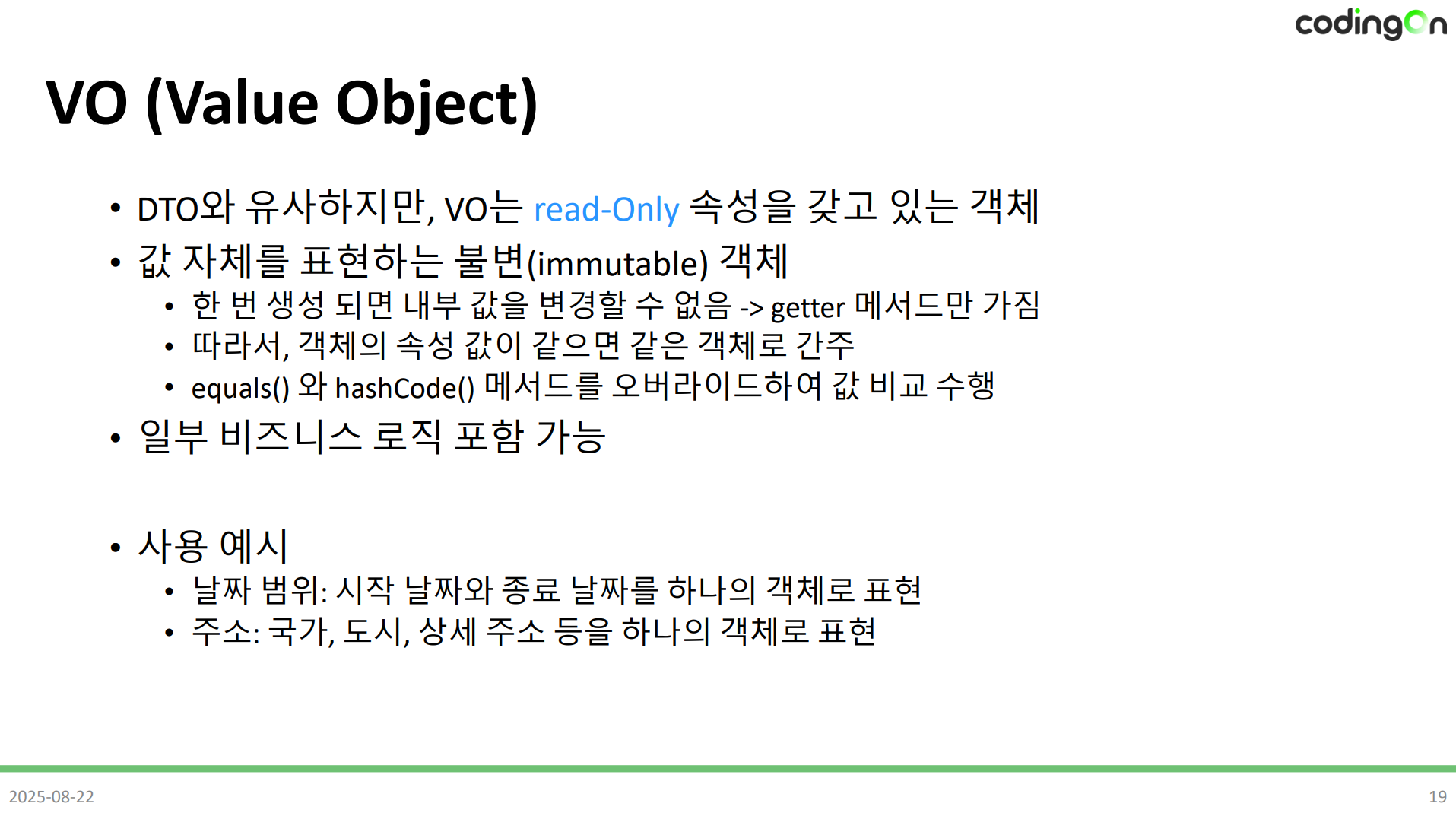 - DTO와 유사하지만, VO는 read-only 속성을 갖고 있는 객체