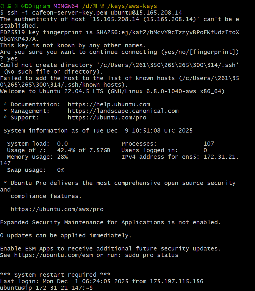 ssh -i cafeon-server-key.pem ubuntu@내 EC2 퍼블릭 IP